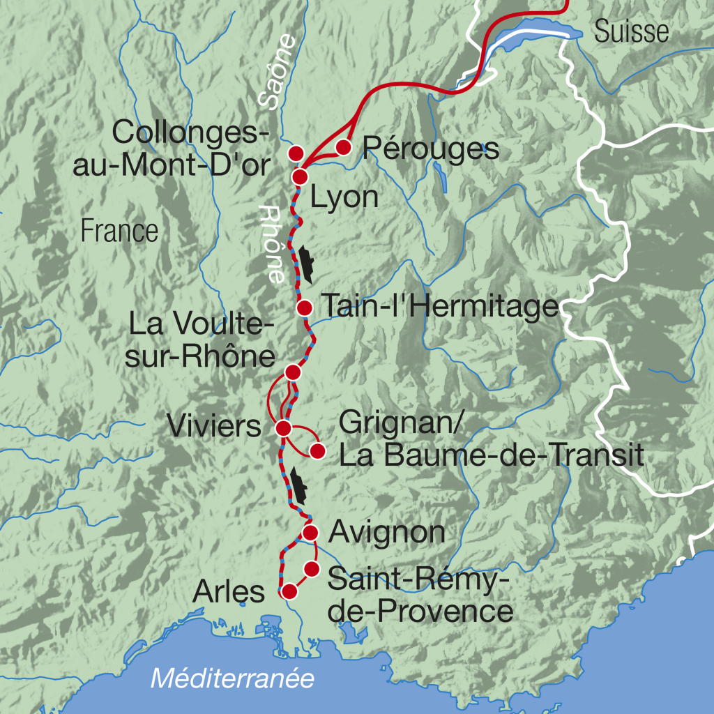 1er jour, Suisse - Pérouges - Lyon: Le voyage débute avec les premiers coups de pédale. Au départ de Château-Gaillard, dans l’Ain, l’itinéraire vous mènera via Saint-Maurice-de-Rémens jusqu’aux portes de Pérouges. Classé parmi les plus beaux villages de France, ses ruelles pavées vous transporteront au cœur du Moyen Age. Continuation pour Lyon et l’embarquement à bord du MS Camargue. Première soirée à bord. (itinéraire journalier: env. 20 km; 210 m. de dénivelé positif / 200 m. de dénivelé négatif)