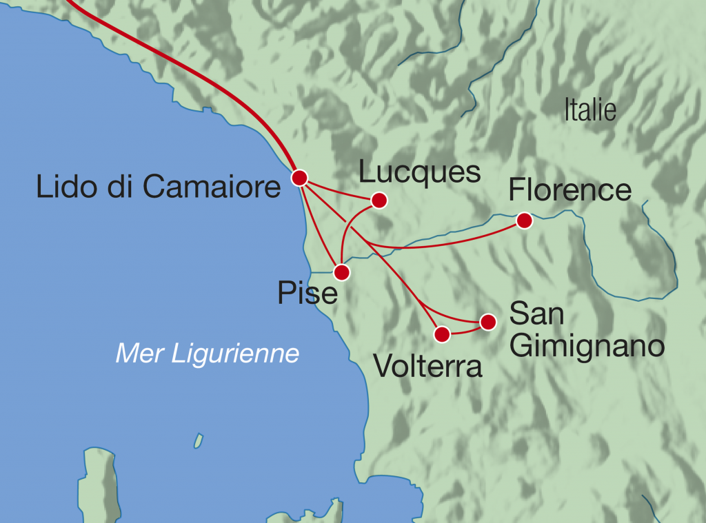 Région emblématique du centre de l’Italie, la Toscane est connue pour la beauté de ses paysages, pour ses douces collines parsemées de cyprès, pour sa richesse architecturale et bien sûr pour ses délices culinaires. Berceau de la Renaissance, ses villes sont de véritables musées à ciel ouvert, arborant fièrement les vestiges d’une révolution artistique qui influença l’Europe tout entière. De Florence à Pise, en passant par Lucques et la plus ancienne cité étrusque au monde, ce voyage vous dévoilera tous les charmes et l’élégance de l’Italie.