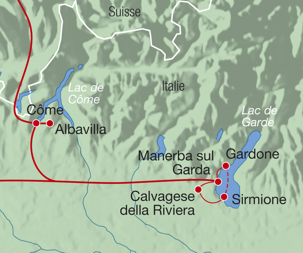 2e jour, excursion lac de Garde: En mai, le lac de Garde se révèle dans toute sa splendeur: lumières douces, jardins en fleurs et villages scintillant au bord de l’eau, invitant à savourer la beauté paisible de la belle saison. Départ en croisière pour rejoindre Sirmione, la pittoresque cité du bout du lac. Sa situation exceptionnelle, ses ruelles animées et ses terrasses en font une destination privilégiée. Balade guidée puis temps libre pour y flâner selon vos envies. Dans l’après-midi, visite d’une cave et dégustation avant le retour à l’hôtel. Dans cette région baignée de soleil, les vignobles s’épanouissent et donnent naissance à des vins raffinés, empreints de la douceur et du souffle méditerranéen des rives du lac.