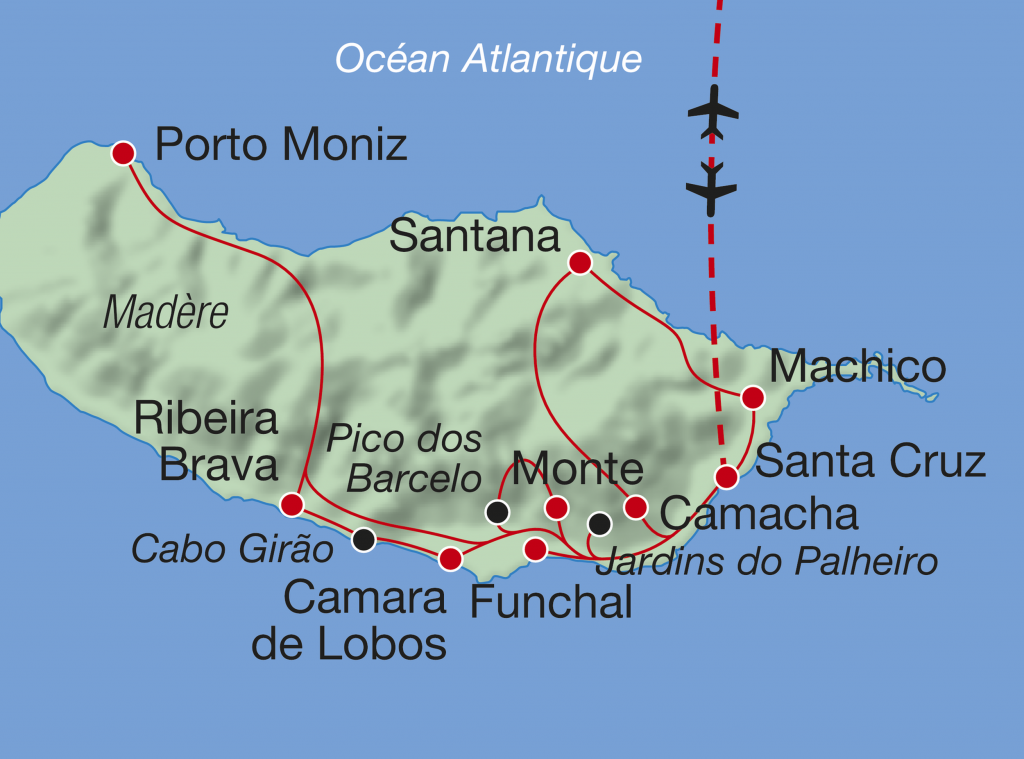 1er jour, Suisse - Santa Cruz: Arrivée individuelle à l'aéroport de Genève ou transfert en car Marti de votre lieu de départ (contre supplément). En compagnie de votre guide-accompagnateur, envol pour Madère. A votre arrivée, transfert en car local jusqu'à Santa Cruz. Demi-pension.