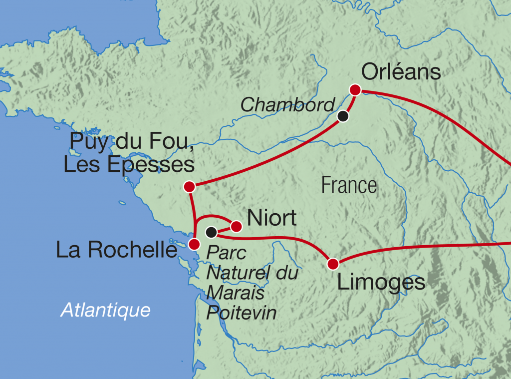 Plongez dans l’univers de l'un des meilleurs parcs à thème au monde en parcourant l’Histoire au Puy du Fou! Puis partez à la découverte du château de Chambord et de son architecture extraordinaire avant de tourner le regard vers la captivante cité de La Rochelle. Une halte dans l'univers mystérieux du Marais Poitevin donnera assurément à ce voyage une touche supplémentaire de magie et d'émotion.