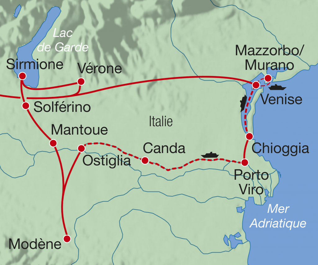 7e jour, Solférino - lac de Garde - Vérone: Débarquement et départ pour le lac de Garde. En route, passage par Solférino, où s’est déroulée une bataille sanglante opposant les troupes françaises et autrichiennes en 1859. Ce terrible affrontement inspira à Henri Dunant la création de la Croix-Rouge. Un mémorial lui rend hommage. Arrivée à Sirmione en fin de matinée. Temps libre puis balade guidée avant de rejoindre Vérone. Installation à l’hôtel pour 2 nuits. Soirée libre en ville.