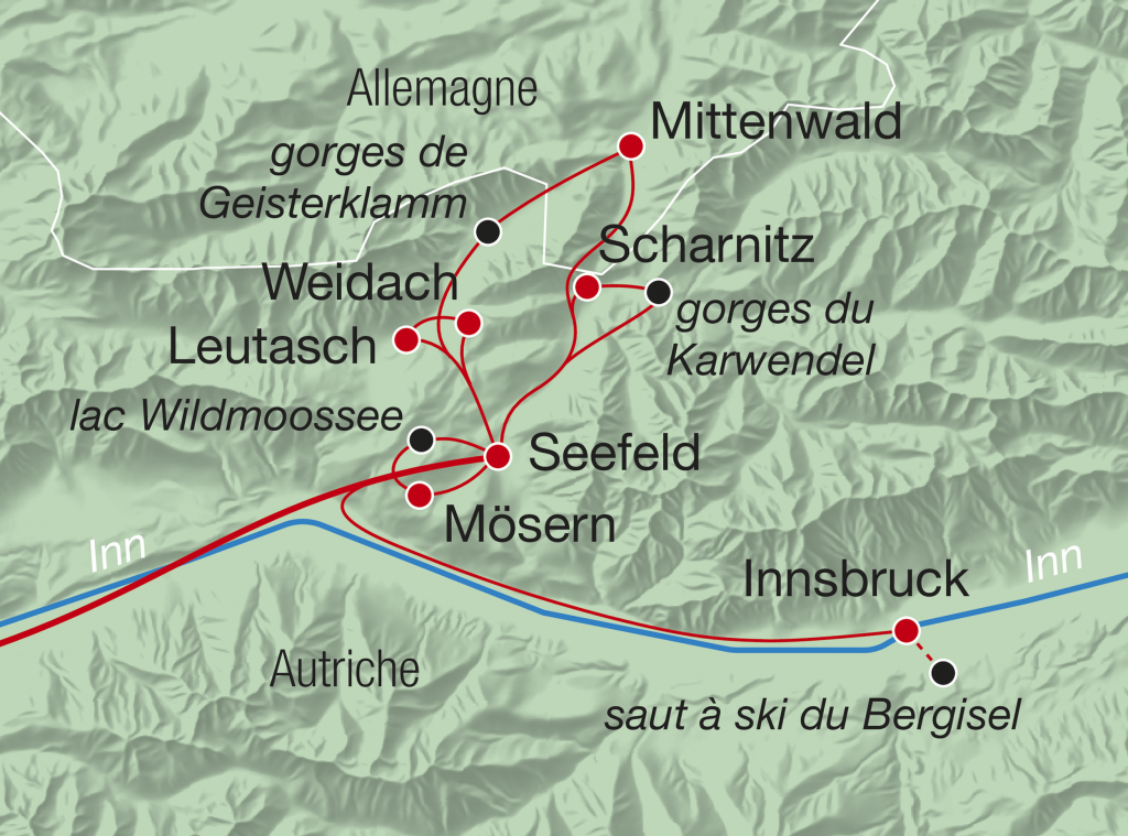 2e jour, excursion aux gorges de Geisterklamm - Mittenwald: Départ en car pour la vallée de Leutasch et ses fameuses gorges de Geisterklamm, peuplées de tout un monde de roches et de légendes. Un sentier bien aménagé vous mènera à un pont surplombant audacieusement le torrent Leutascher Ache. Tout en savoureux le paysage, vous poursuivrez votre marche en direction de Mittenwald. Ce village, célèbre pour ses maisons richement décorées de fresques colorées, invite à la flânerie. Les «Lüftlmalereien» illustrent des scènes de la vie quotidienne et racontent l'ancienne tradition de la lutherie remontant à 1684. Temps libre avant le retour en car à Seefeld. (itinéraire journalier: env. 4,5 km; 50 m. de dénivelé positif / 145 m. de dénivelé négatif)